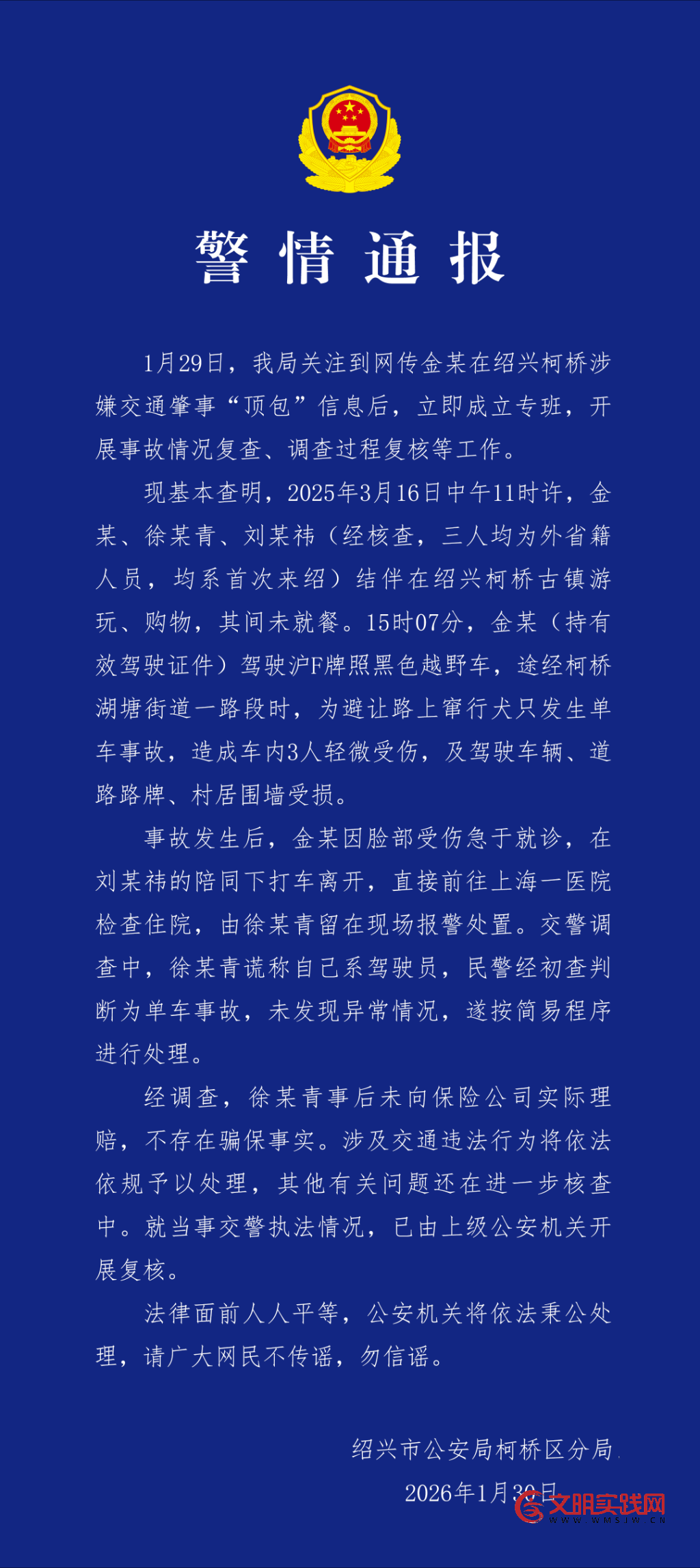 金晨涉嫌交通肇事“顶包”?浙江绍兴柯桥警方通报