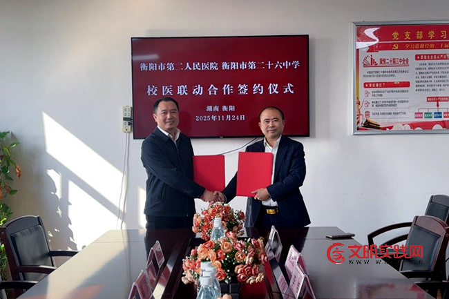 文明实践网湖南讯(通讯员:谷彤玲)为深入贯彻“健康中国”战略部署,深化“医校共建”育人机制,全面提升师生心理健康素养,筑牢青少年心理防护屏障,11月24日,衡阳市第二十六中学与衡阳市第二人民医院(衡阳市精神卫生中心)举行医校合作签约仪式。衡阳市...